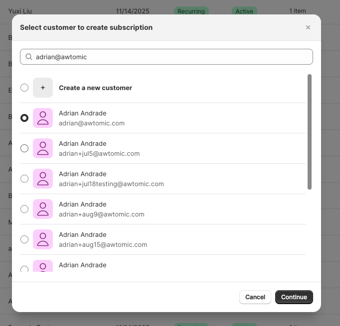 Once you select "Continue" on the popup, you'll be taken to a page titled "Create subscription" you'll notice that the customer you had previously selected is displayed at the top.