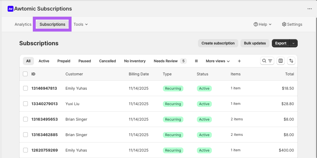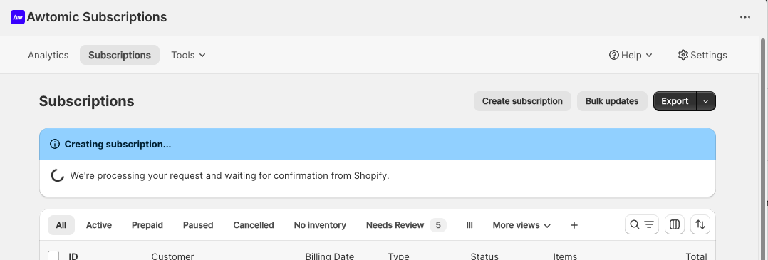 You’ll return to the Subscription List page. While the subscription is being created in Shopify:
