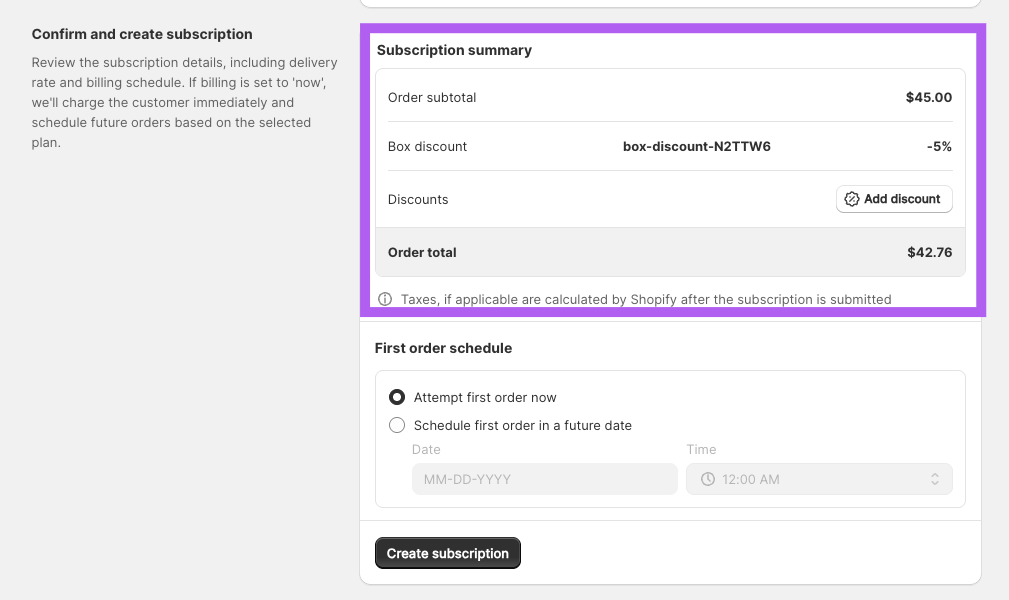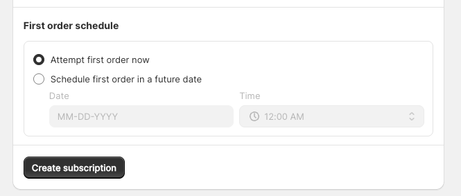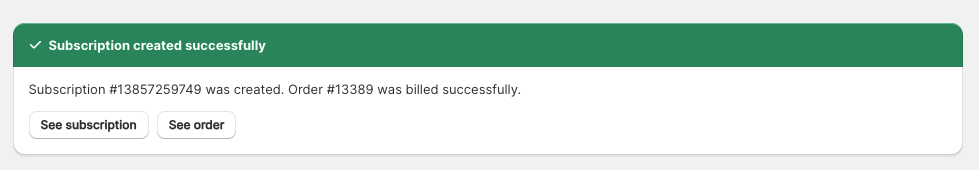 Note: If you click “See subscription” too quickly, the contract may not have finished creating in Shopify. Refreshing the page usually resolves this.