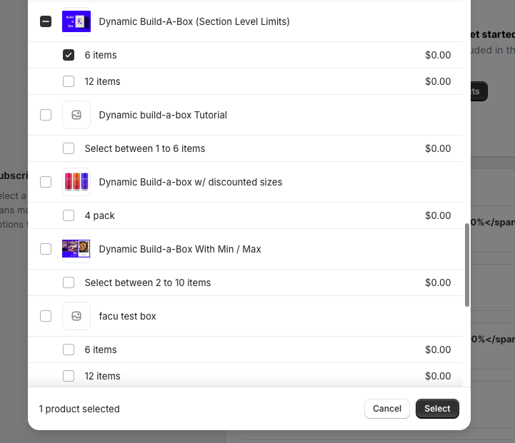 Within this popup, you should be able to select individual products or our bundles as well. Pictured below, the user has selected a 6-item bundle product.